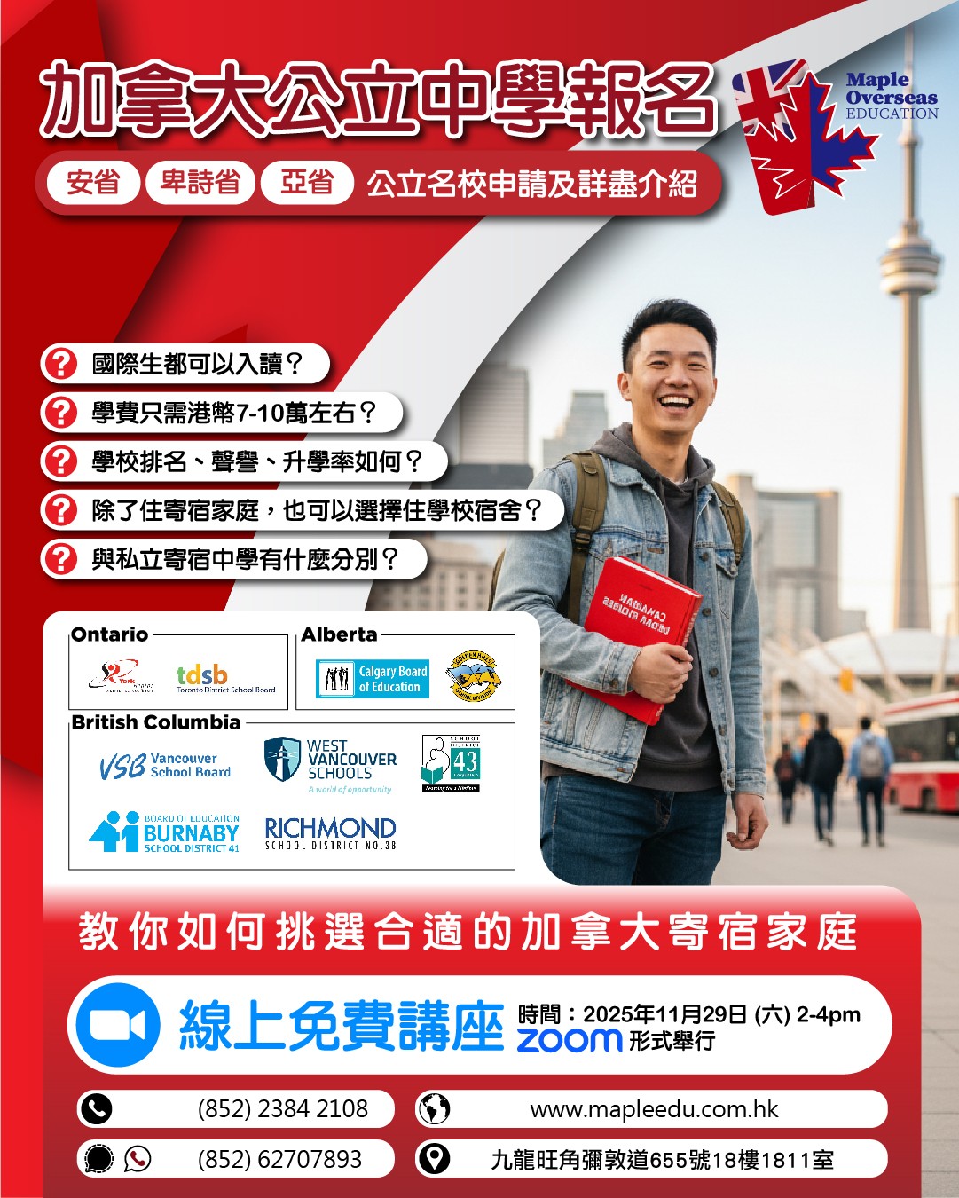 英國 升學 加拿大 升學 美國 升學 澳洲 升學 紐西蘭 升學 成功案例 畢業生分享 英國升學資訊 加拿大升學資訊 澳洲升學資訊 最新活動 升學顧問 | 一站式海外升學服務|楓葉教育 Maple Overseas Education 楓葉教育是專業的海外升學顧問,擁有近20年海外升學服務經驗。 幫助學生前往英國、加拿大、美國、澳洲、紐西蘭等地留學。 提供專業海外升學評估、UCAS咨詢、入學申請、海外簽證等服務。 卓越的海外升學服務 本中心與100多所海外院校保持著穩固的合作關係,為國內、香港及澳門的學生提供一站式海外升學服務,協助學生實現入讀英國、加拿大、美國、澳洲及紐西蘭等地頂尖學校的夢想。 本中心致力於為學生提供最優質、最全面的升學資訊,並竭盡所能幫助學生挑選最適合他們的學校。無論是申請手續、簽證申請、住宿安排或是課程選擇,我們的專業團隊都會提供最完善的支援。歡迎國內及港澳學生查詢海外升學服務。 專業海外升學顧問 本中心的團隊擁有近20年的海外升學服務經驗,多年來在海外升學行業建立良好的信譽及擴闊的人際網絡。 Maple創辦人Javis及他的顧問團隊均畢業於加拿大或英國著名大學學府,對於海外留學及生活的細節都十分熟悉,能夠以自己曾經的留學經驗,向那些未曾到外國讀書的學生提供深入的交流及建議,讓學生更充分地了解留學的各個方面,做好留學準備。 服務收費 本中心提供一系列專業、全面的海外升學服務,包括選校建議、申請指導、辦理學校入學申請、住宿安排等等,這些服務都是不收取任何費用的。本中心的收入來源來自於與海外院校的合作,作為學校的官方代表為家長和學生提供優質服務。然而,對於一些特別的升學需要,本中心會提供額外可選的收費服務。 家長及學生評價 更多意見反饋 學校網絡優勢 楓葉教育升學中心與過百間海外院校及課程有合作關係,定期與各學校代表會面及保持聯絡,跟進不學生的需求,致力為學生提供最優質的升學資訊,為學生盡心盡力挑選最合適的學校及更有效率地幫助學生辦理入學,令家長安送子女到海外讀書。 一站式升學服務 全方位 升學諮詢及評估 專業、資深的顧問會為學生先進行成績評估,再為學生提供最合適的院校選擇,為學生度身訂做升學安排。 學校申請及 安排報考國際英語試 由幫忙協助填寫申請表,與校方進行面試、安排預約英文考試及核實成績及證書。 機票代辦及 簽證服務 楓葉教育幫忙提供機票價格查詢及幫忙訂購機票。更會為學生提供簽證安排,包括文件準備,翻譯文件及協助辦理簽證。 安排監護人 服務 提供監護人服務,並會跟家長跟進學生在當地與監護人之間的溝通,了解學生在當地的生活情況。 為學生安排 當地接機及住宿 楓葉會幫助學生提供接機服務及指導住宿安排。 跟進學生的海外學習 與生活概況 顧問會與海外學生進行緊密的跟進及了解學生在當地的生活及學習情況,幫忙學生盡快適應留學生活。 轉校 查詢服務 顧問會為學生進行轉校申請及查詢。包括由香港轉到海外讀書及已在海外讀書的學生轉校。 定期舉辦 教育展及面試 楓葉教育會定期參加不同類型的教育展,安排學生與校方代表見面及安排面試。學生可以透過Facebook,SMS,Whatsapp 及電郵接收到相關消息。 熱門學科及大學排名 更多熱門課程資料 海外升學必讀文章 英國大學聯招申請(UCAS Application)相信對有意往英國升讀大學的學生來說,對英國大學聯招方法(UCAS Application)不會陌生,今期主要是提醒大家四個重要的截止申請日期,準備申請明年9月入學者宜加倍留意。 Read more 英國大學銜接課程英國高等教育學府享負盛名,入讀頂尖大學,DSE起碼要5級起跳?其實入讀英國大學的途徑比你想像中多,亦比你想像中輕鬆,不用被它們的名氣嚇怕,你亦有機會成為這些大學的畢業生。 Read more 加拿大大學銜接課程身邊總有朋友想去加拿大讀書,熱門地區有多倫多、溫哥華等地,可能是喜歡當地的風景、享受當地的生活模式、嚮往當地的教育方式等等,又或者是在香港完成中學課程,想在念大學的時候離開舒適圈,在外面訓練自己獨立能力。 Read more 為什麼選擇海外升學? 在競爭激烈的教育環境中,海外升學已成為許多學生和家長的優先選擇。海外升學能為學生提供更豐富的專業選擇和具國際認可性的教育機會。無論是英國、美國、加拿大還是澳洲的頂尖學府或頂尖中學,都能讓學生接觸前沿學科資源,並在全球化環境中培養流利英語能力,這對未來進入金融、科技、醫療等高端職業至關重要。 相比本地學制,海外升學途徑更靈活,例如英國3年完成本科、美國允許探索興趣後再選專業,而澳洲、英國、加拿大等國提供DSE成績未達標學生的銜接課程。這些選擇讓學生能根據自身優勢規劃最適合的升學路徑。 選擇一間專業的海外升學中心,能幫助你順利踏上國際教育之路。無論是英國、加拿大、美國、澳洲還是紐西蘭,海外留學不僅能提升學術水平,還能開拓國際視野,增強語言能力,並為未來職業發展奠定堅實基礎。 作為經驗豐富的海外升學顧問,楓葉教育 Maple Overseas Education 深知外國升學的挑戰與機遇。我們提供全面的升學評估、院校申請、簽證輔導等服務,確保每位學生都能找到最適合的海外升學方案。無論你的目標是頂尖大學還是專業課程,海外升學中心的專業團隊都能為你量身定制升