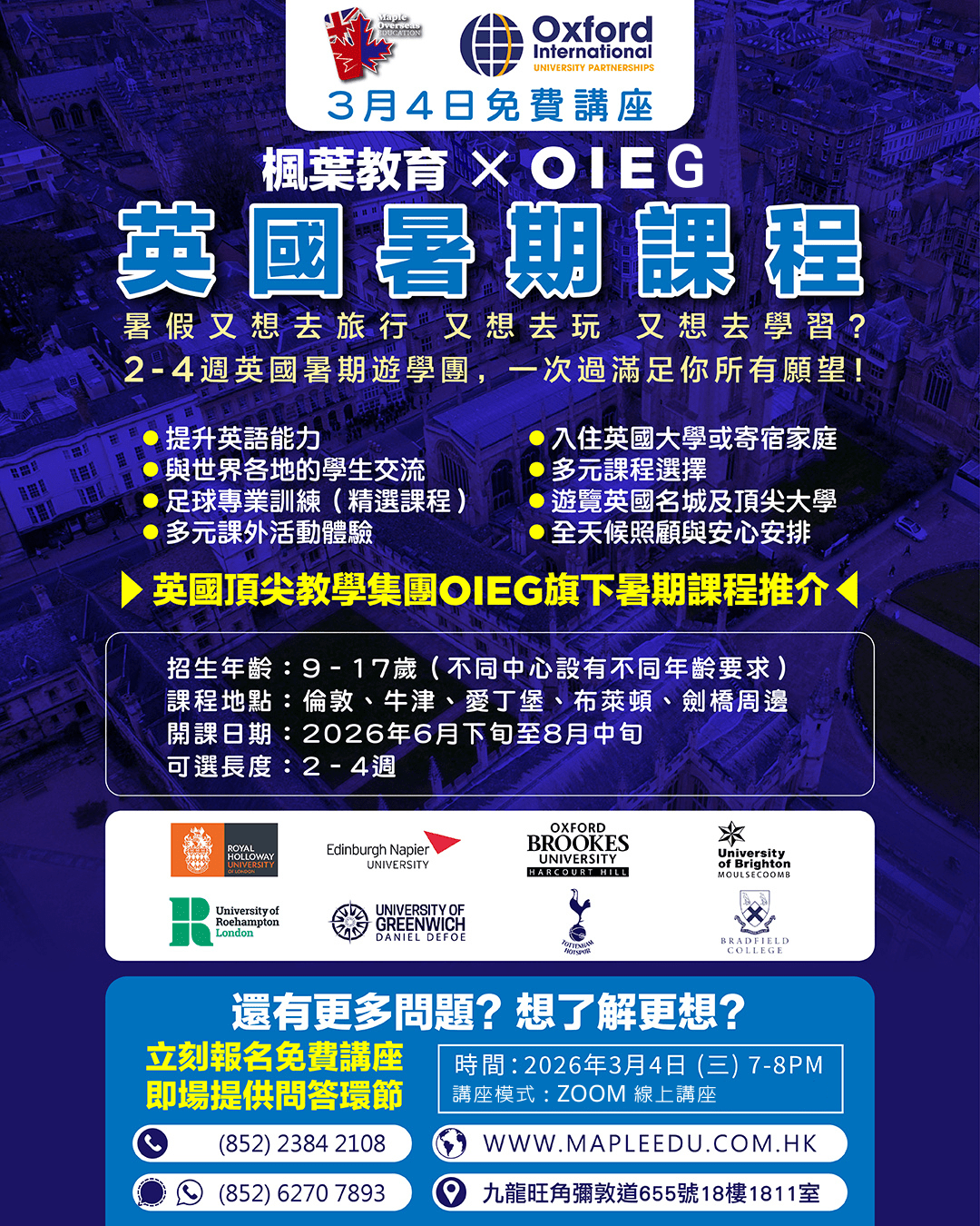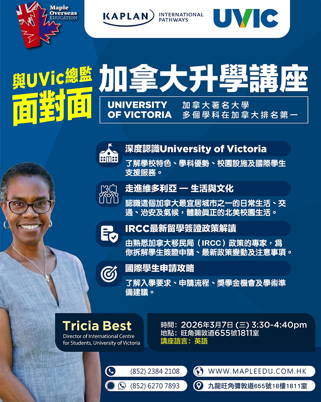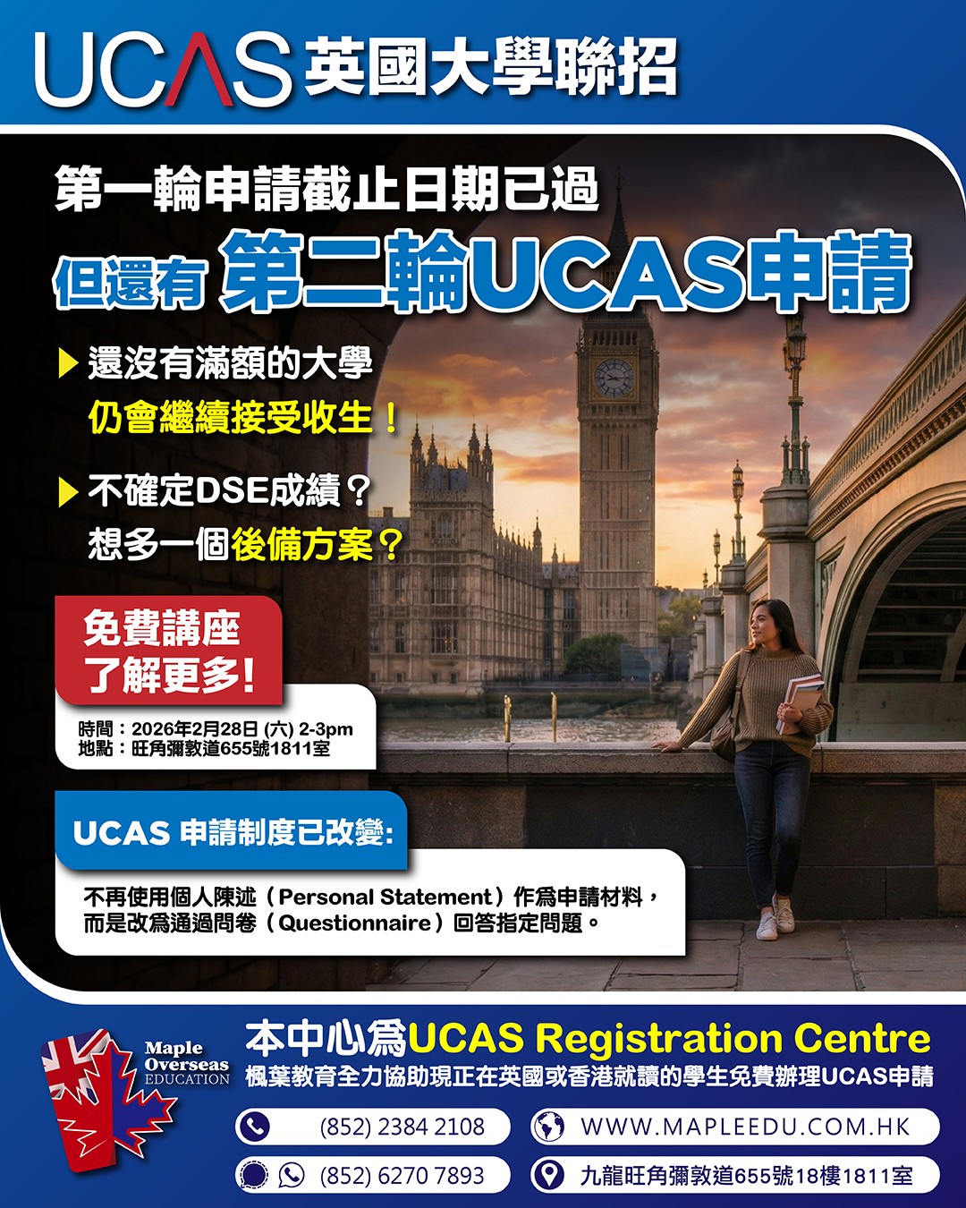 英國 升學 加拿大 升學 美國 升學 澳洲 升學 紐西蘭 升學 最新活動 英國升學資訊 加拿大升學資訊 澳洲升學資訊 升學顧問 | 一站式海外升學服務|楓葉教育 Maple Overseas Education 楓葉教育是專業的海外升學顧問,擁有近20年海外升學服務經驗。 幫助學生前往英國、加拿大、美國、澳洲、紐西蘭等地留學。 提供專業海外升學評估、UCAS咨詢、入學申請、海外簽證等服務。 卓越的海外升學服務 本中心與100多所海外院校保持著穩固的合作關係,為國內、香港及澳門的學生提供一站式海外升學服務,協助學生實現入讀英國、加拿大、美國、澳洲及紐西蘭等地頂尖學校的夢想。 本中心致力於為學生提供最優質、最全面的升學資訊,並竭盡所能幫助學生挑選最適合他們的學校。無論是申請手續、簽證申請、住宿安排或是課程選擇,我們的專業團隊都會提供最完善的支援。歡迎國內及港澳學生查詢海外升學服務。 專業海外升學顧問 本中心的團隊擁有近20年的海外升學服務經驗,多年來在海外升學行業建立良好的信譽及擴闊的人際網絡。 Maple創辦人Javis及他的顧問團隊均畢業於加拿大或英國著名大學學府,對於海外留學及生活的細節都十分熟悉,能夠以自己曾經的留學經驗,向那些未曾到外國讀書的學生提供深入的交流及建議,讓學生更充分地了解留學的各個方面,做好留學準備。 服務收費 本中心提供一系列專業、全面的海外升學服務,包括選校建議、申請指導、辦理學校入學申請、住宿安排等等,這些服務都是不收取任何費用的。本中心的收入來源來自於與海外院校的合作,作為學校的官方代表為家長和學生提供優質服務。然而,對於一些特別的升學需要,本中心會提供額外可選的收費服務。 家長及學生評價 更多意見反饋 一站式升學服務 全方位 升學諮詢及評估 專業、資深的顧問會為學生先進行成績評估,再為學生提供最合適的院校選擇,為學生度身訂做升學安排。 學校申請及 安排報考國際英語試 由幫忙協助填寫申請表,與校方進行面試、安排預約英文考試及核實成績及證書。 機票代辦及 簽證服務 楓葉教育幫忙提供機票價格查詢及幫忙訂購機票。更會為學生提供簽證安排,包括文件準備,翻譯文件及協助辦理簽證。 安排監護人 服務 提供監護人服務,並會跟家長跟進學生在當地與監護人之間的溝通,了解學生在當地的生活情況。 為學生安排 當地接機及住宿 楓葉會幫助學生提供接機服務及指導住宿安排。 跟進學生的海外學習 與生活概況 顧問會與海外學生進行緊密的跟進及了解學生在當地的生活及學習情況,幫忙學生盡快適應留學生活。 轉校 查詢服務 顧問會為學生進行轉校申請及查詢。包括由香港轉到海外讀書及已在海外讀書的學生轉校。 定期舉辦 教育展及面試 楓葉教育會定期參加不同類型的教育展,安排學生與校方代表見面及安排面試。學生可以透過Facebook,SMS,Whatsapp 及電郵接收到相關消息。 關於楓葉升學教育中心 楓葉教育 Maple Overseas Education 是香港知名的海外升學顧問,擁有近20年豐富經驗,協助無數學生成功實現海外留學夢想。作為專業的海外升學中心,我們提供一站式服務,涵蓋不同國家和不同年紀的升學評估、UCAS 申請、院校推薦、簽證辦理等,確保你的外國升學之路順暢無阻。 我們的海外升學顧問團隊熟悉英國、加拿大、美國、澳洲、紐西蘭等熱門留學國家的教育體系,能根據學生的學術背景、興趣及職業規劃,推薦最合適的升學方案。無論是申請頂尖大學、寄宿學校,還是語言課程,楓葉教育都能為你提供專業指導,讓你的海外升學旅程更輕鬆、更成功。 更多關於我們的資料 學校網絡優勢 楓葉教育升學中心與過百間海外院校及課程有合作關係,定期與各學校代表會面及保持聯絡,跟進不學生的需求,致力為學生提供最優質的升學資訊,為學生盡心盡力挑選最合適的學校及更有效率地幫助學生辦理入學,令家長安送子女到海外讀書。 海外升學必讀文章 英國大學聯招申請(UCAS Application)相信對有意往英國升讀大學的學生來說,對英國大學聯招方法(UCAS Application)不會陌生,今期主要是提醒大家四個重要的截止申請日期,準備申請明年9月入學者宜加倍留意。 Read more 英國大學銜接課程英國高等教育學府享負盛名,入讀頂尖大學,DSE起碼要5級起跳?其實入讀英國大學的途徑比你想像中多,亦比你想像中輕鬆,不用被它們的名氣嚇怕,你亦有機會成為這些大學的畢業生。 Read more 加拿大大學銜接課程身邊總有朋友想去加拿大讀書,熱門地區有多倫多、溫哥華等地,可能是喜歡當地的風景、享受當地的生活模式、嚮往當地的教育方式等等,又或者是在香港完成中學課程,想在念大學的時候離開舒適圈,在外面訓練自己獨立能力。 Read more 成功案例 畢業生分享 熱門學科及大學排名 更多熱門課程資料 為什麼選擇海外升學? 在競爭激烈的教育環境中,海外升學已成為許多學生和家長的優先選擇。海外升學能為學生提供更豐富的專業選擇和具國際認可性的教育機會。無論是英國、美國、加拿大還是澳洲的頂尖學府或頂尖中學,都能讓學生接觸前沿學科資源,並在全球化環境中培養流利英語能力,這對未來進入金融、科技、醫療等高端職業至關重要。 相比本地學制,海外升學途徑更靈活,例如英國3年完成本科、美國允許探索興趣後再選專業,而澳洲、英