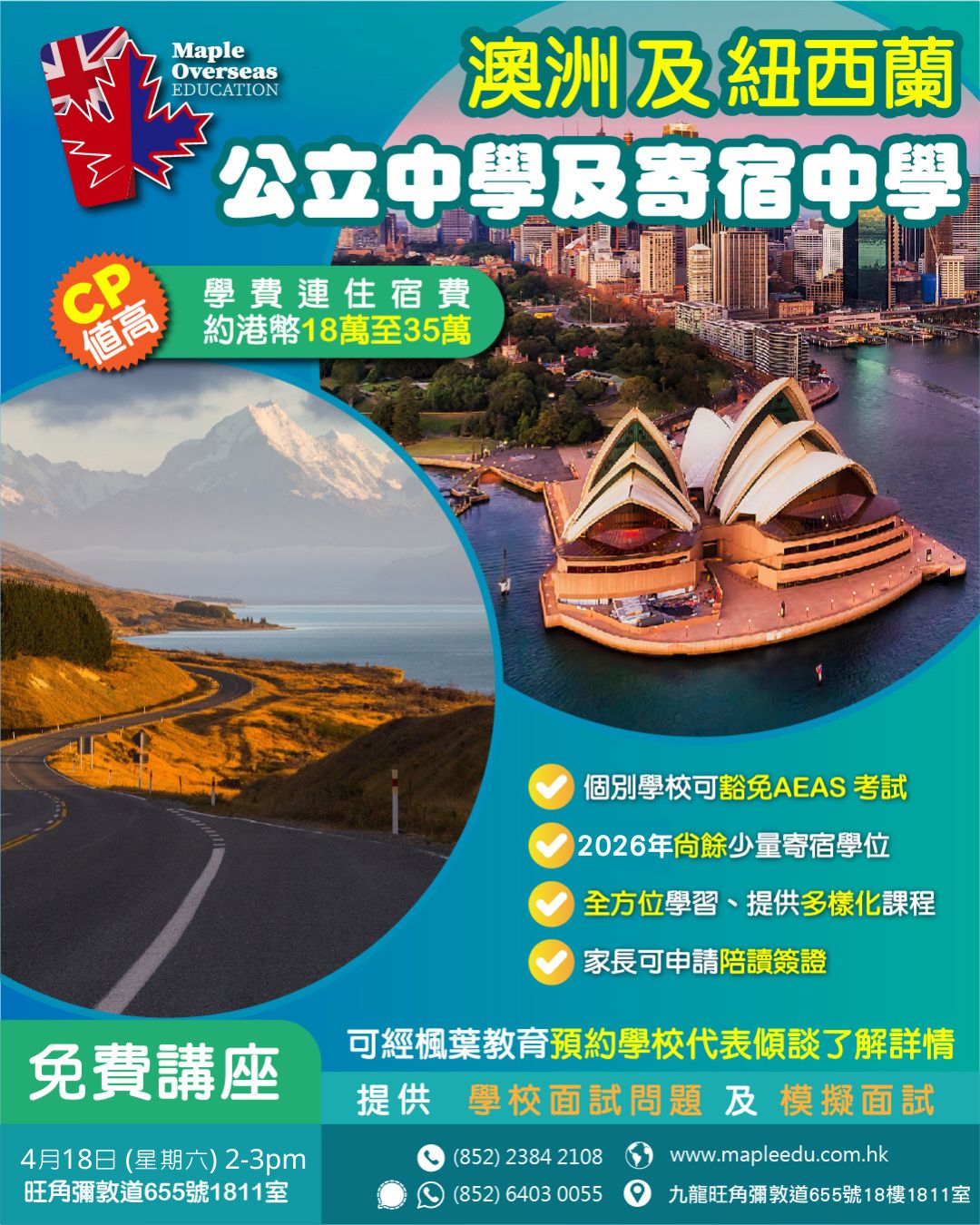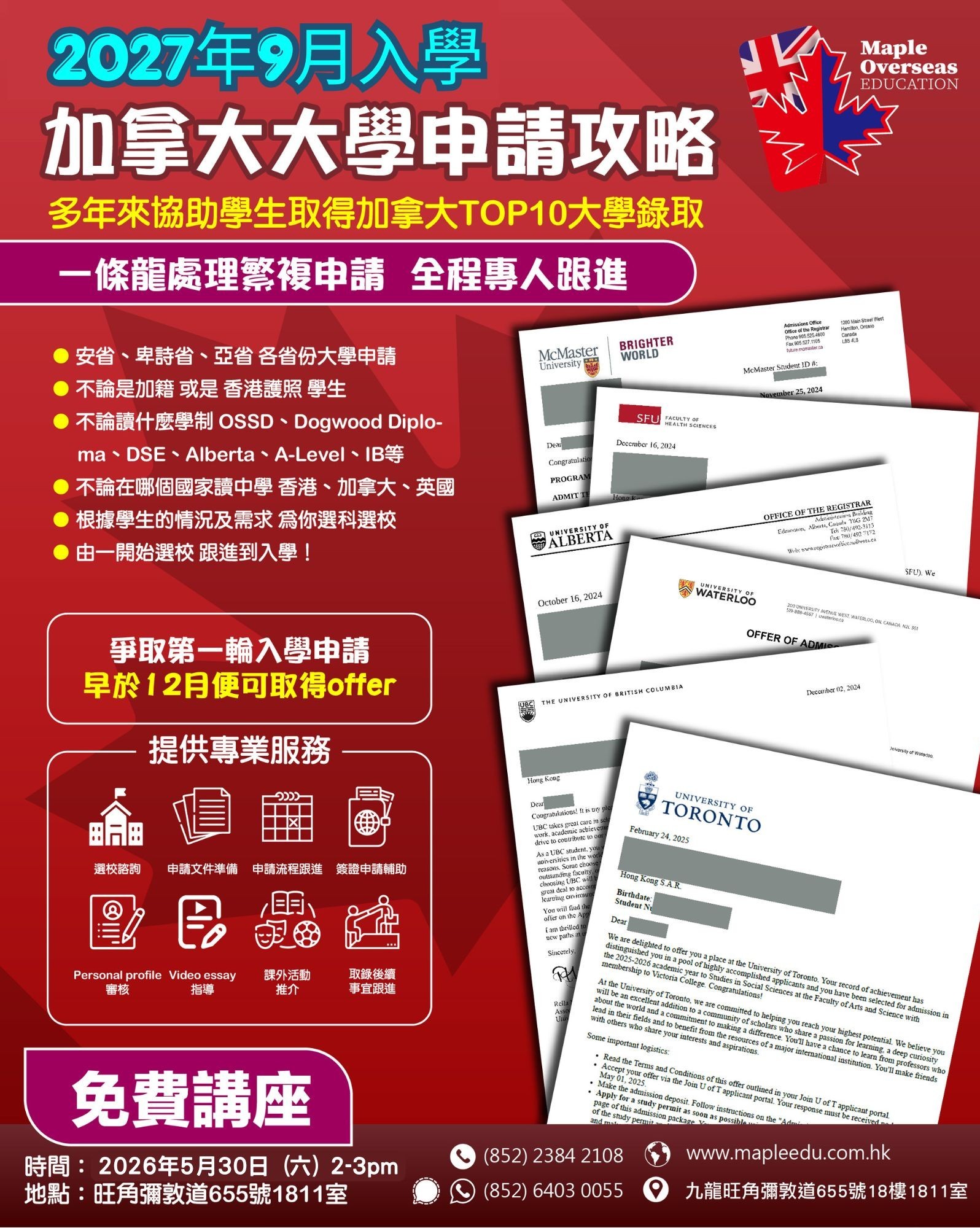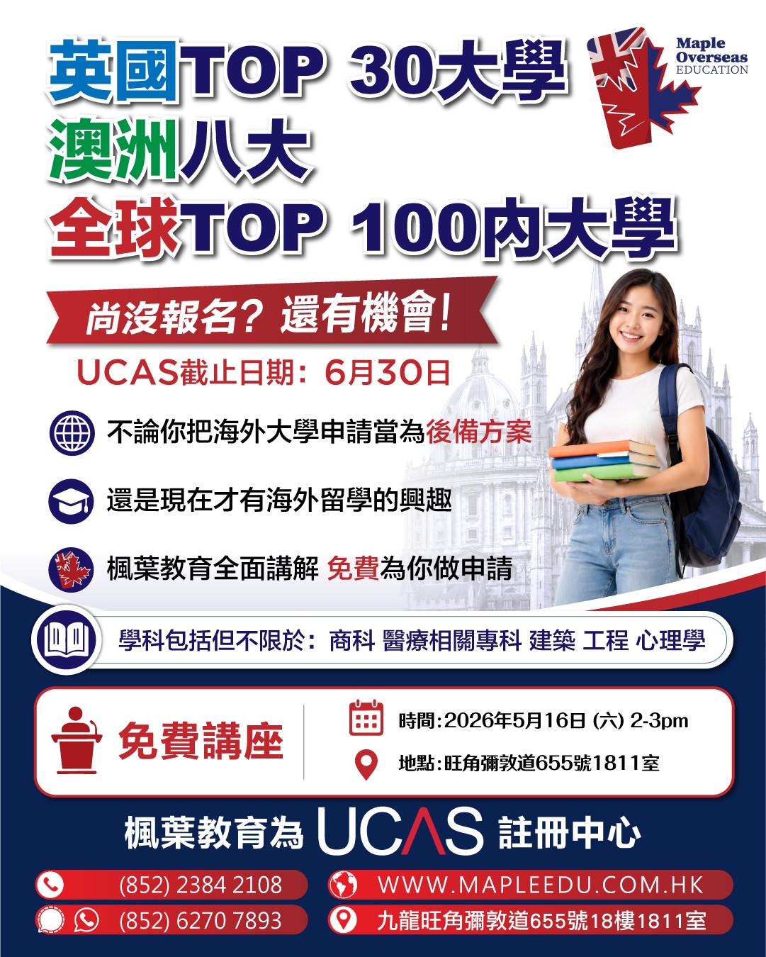 英國 升學 加拿大 升學 美國 升學 澳洲 升學 紐西蘭 升學 楓葉教育 · 核心數據一覽 6 個國家及地區 英、澳、紐、美、加、香港 可同時為學生辦理不同國家申請 靈活規劃升學路徑 1:2 顧問貼身跟進 最少一位顧問全程跟進 中途絕不隨意轉換人員 告別「查詢無門」 24/7 緊急支援服務 工作日持續跟進 假日緊急情況即時處理 絕不拖延進度 影響申請 10 + 15 創辦人雙重經驗 10年+ 加拿大生活讀書經驗 15年+ 辦理不同國家顧問經驗 第一手當地知識,專業規劃 5000+ Offer Letter 各國頂尖中學及大學取錄信 持續更新成功案例 見證團隊專業實力 100% 簽證批核率 包括曾被拒簽的複雜個案 專業團隊信心保證 讓您無後顧之憂 ⚡ 合作院校申請全程免費 · 立即預約免費諮詢 · 度身訂造升學規劃 ⚡ 最新活動 英國升學資訊 加拿大升學資訊 澳洲升學資訊 升學顧問 | 一站式海外升學服務|楓葉教育 Maple Overseas Education 楓葉教育是專業的海外升學顧問,團隊擁有近20年海外升學服務經驗。 幫助學生前往英國、加拿大、美國、澳洲、紐西蘭、香港等地升學。 提供專業海外升學評估、UCAS咨詢、入學申請、海外簽證等服務。 卓越的海外升學服務 本中心與100多所海外院校保持著穩固的合作關係,為國內、香港及澳門的學生提供一站式海外升學服務,協助學生實現入讀英國、加拿大、美國、澳洲及紐西蘭等地頂尖學校的夢想。 本中心致力於為學生提供最優質、最全面的升學資訊,並竭盡所能幫助學生挑選最適合他們的學校。無論是申請手續、簽證申請、住宿安排或是課程選擇,我們的專業團隊都會提供最完善的支援。歡迎國內及港澳學生查詢海外升學服務。 專業海外升學顧問 本中心的團隊擁有近20年的海外升學服務經驗,多年來在海外升學行業建立良好的信譽及擴闊的人際網絡。 Maple創辦人Javis及他的顧問團隊均畢業於加拿大或英國著名大學學府,對於海外留學及生活的細節都十分熟悉,能夠以自己曾經的留學經驗,向那些未曾到外國讀書的學生提供深入的交流及建議,讓學生更充分地了解留學的各個方面,做好留學準備。 服務收費 本中心提供一系列專業、全面的海外升學服務,包括選校建議、申請指導、辦理學校入學申請、住宿安排等等,這些服務都是不收取任何費用的。本中心的收入來源來自於與海外院校的合作,作為學校的官方代表為家長和學生提供優質服務。然而,對於一些特別的升學需要,本中心會提供額外可選的收費服務。 家長及學生評價 更多意見反饋 一站式升學服務.英國、澳洲、紐西蘭、美國、加拿大、香港 全方位 升學諮詢及評估 專業、資深的顧問會為學生先進行成績評估,再為學生提供最合適的院校選擇,為學生度身訂做升學安排。 學校申請及 安排報考國際英語試 由幫忙協助填寫申請表,與校方進行面試、安排預約英文考試及核實成績及證書。 機票代辦及 簽證服務 楓葉教育幫忙提供機票價格查詢及幫忙訂購機票。更會為學生提供簽證安排,包括文件準備,翻譯文件及協助辦理簽證。 安排監護人 服務 提供監護人服務,並會跟家長跟進學生在當地與監護人之間的溝通,了解學生在當地的生活情況。 為學生安排 當地接機及住宿 楓葉會幫助學生提供接機服務及指導住宿安排。 跟進學生的海外學習 與生活概況 顧問會與海外學生進行緊密的跟進及了解學生在當地的生活及學習情況,幫忙學生盡快適應留學生活。 轉校 查詢服務 顧問會為學生進行轉校申請及查詢。包括由香港轉到海外讀書及已在海外讀書的學生轉校。 定期舉辦 教育展及面試 楓葉教育會定期參加不同類型的教育展,安排學生與校方代表見面及安排面試。學生可以透過Facebook,SMS,Whatsapp 及電郵接收到相關消息。 關於楓葉升學教育中心 楓葉教育 Maple Overseas Education 是香港知名的海外升學顧問,擁有近20年豐富經驗,協助無數學生成功實現海外留學夢想。作為專業的海外升學中心,我們提供一站式服務,涵蓋不同國家和不同年紀的升學評估、UCAS 申請、院校推薦、簽證辦理等,確保你的外國升學之路順暢無阻。 我們的海外升學顧問團隊熟悉英國、加拿大、美國、澳洲、紐西蘭等熱門留學國家的教育體系,能根據學生的學術背景、興趣及職業規劃,推薦最合適的升學方案。無論是申請頂尖大學、寄宿學校,還是語言課程,楓葉教育都能為你提供專業指導,讓你的海外升學旅程更輕鬆、更成功。 更多關於我們的資料 學校網絡優勢 楓葉教育升學中心與過百間海外院校及課程有合作關係,定期與各學校代表會面及保持聯絡,跟進不學生的需求,致力為學生提供最優質的升學資訊,為學生盡心盡力挑選最合適的學校及更有效率地幫助學生辦理入學,令家長安送子女到海外讀書。 海外升學必讀文章 英國大學聯招申請(UCAS Application)相信對有意往英國升讀大學的學生來說,對英國大學聯招方法(UCAS Application)不會陌生,今期主要是提醒大家四個重要的截止申請日期,準備申請明年9月入學者宜加倍留意。 Read more 英國大學銜接課程英國高等教育學府享負盛名,入讀頂尖大學,DSE起碼要5級起跳?其實入讀英國大學的途徑比你想像中多,亦比你想像中輕鬆,不用被它們的名氣嚇怕,你亦有機會成為這些大學的畢業生。 Read more 加拿大大學銜接課程身邊總有朋友想去加拿大讀書,熱門地區有多倫多、溫哥華等地,可
