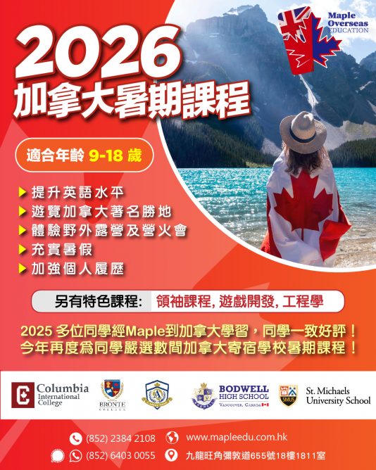 Search for: 【暑期課程】加拿大及英國暑期課程 邊玩邊上堂 盡早報名!🔥把握機會! 今年我們精心挑選了多個暑期課程 Read more 【加拿大升學】加拿大學簽重大更新:2026年簽證配額下調,PAL 名額有限,建議儘早規劃並尋求專業協助加拿大移民局(IRCC)近日公佈了 2026 年國際學生學簽配額及各省分配細節。 Read more 【2026年9月開學】加拿大公立及私立寄宿中學 海外留學CP值極高想去加拿大讀書?學費最平可低至7.5萬港元! Read more 【UBC Okanagan】加拿大Top 3大學 入學門檻更低 獎學金豐富!🎓想入讀加拿大頂尖大學UBC,但擔心成績未夠? Read more 【DSE出路】2025年DSE放榜 7月16日 即刻幫你找學校收到成績感到迷茫?楓葉教育隨時為你提供升學指導, Read more 【加拿大升學】考完DSE先決定去加拿大讀書,仍有機會入讀加拿大大學嗎?如果你錯過了申請的截止日期,不用擔心! Read more 【加拿大升學】考完DSE才想去加拿大升學 錯過截止日期怎麼辦?🔸 加拿大頂尖大學一般在年初截止報名,怎麼辦? Read more 加拿大寄宿中學:香港學生升學之選的完整指南楓葉教育升學中心是過百間加拿大寄宿學校的官方代表,授權為學生免費辦理入學申請。 Read more 【暑假遊學課程】加拿大及英國暑期課程 盡早報名!🔥把握機會! 今年我們精心挑選了多個暑期課程,讓同學們在學習英語的同時,拓展視野,增強履歷!🔥 Read more 【加拿大升學】各大院校申請日期已過,仍想入讀加拿大大學嗎?如果你錯過了申請的截止日期,不用擔心!我們提供的入讀大學銜接課程Stage II,相當於入讀大學一年級,讓你翌年順利升上大學二年級! Read more