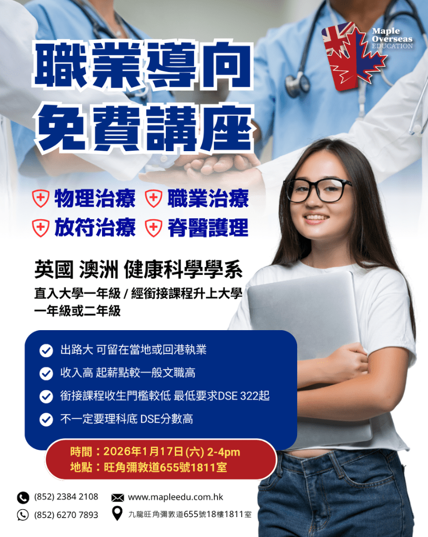 如有意於英國或澳洲修讀Health Sciences課程,歡迎報名參加本次免費講座,了解更多資訊!📝講座完結後更可以即場做一對一免費諮詢,即時為你解答疑難! 🆓
