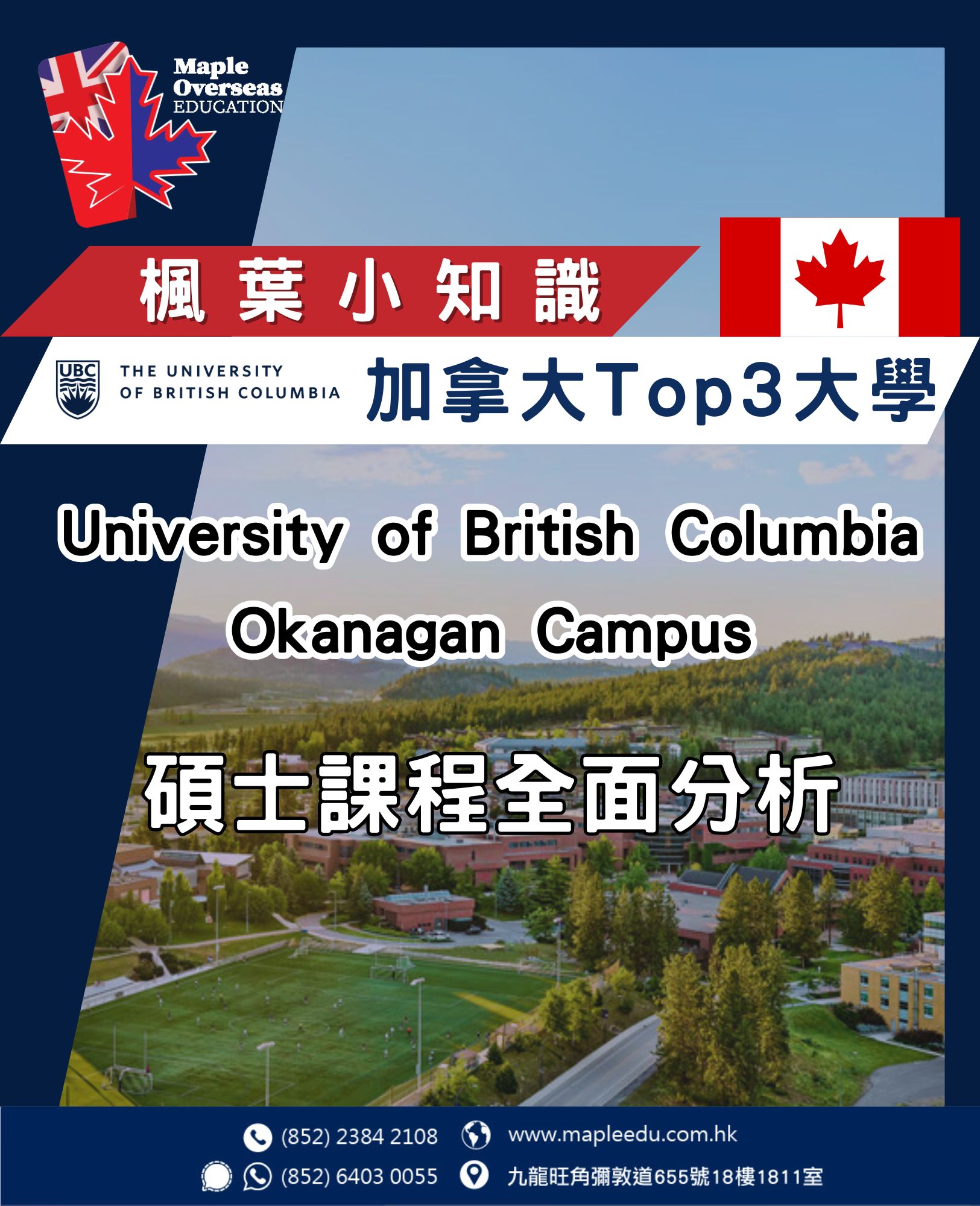 【加拿大升學】UBC Okanagan碩士課程全攻略 March 9, 2026 一、簡介 加拿大升學是不少香港學生的夢想,而The University of British Columbia (UBC) 作為加拿大頂尖學府,更是許多人的首選。作為UBC Okanagan校區的官方合作夥伴,楓葉教育為你詳細拆解UBC Okanagan的碩士課程、入學要求、學費資訊及就業前景,助你一步步邁向這所世界級名校。 二、為什麼選擇UBC Okanagan? 1. UBC大學排名與聲譽 排名機構 2025-2026排名 QS World University Rankings 2026 全球第40位 Times Higher Education 2025 全球第41位 Shanghai Ranking 2025 全球第53位、加拿大第2位 UBC成立於1915年,是加拿大頂尖研究型大學之一,擁有卓越的學術聲譽和全球影響力。UBC Okanagan校區位於卑詩省的Kelowna市,是該省第三大都會區,也是加拿大發展最快的地區之一。 2. UBC Okanagan校區優勢 優勢 詳情 校園規模 佔地208.6公頃,擁有10,400名本科生及1,340名研究生 國際化程度 研究生當中國際學生佔5%,本科生中國際學生佔15%,學生來自110個國家 地理位置 位於Okanagan Valley,距離溫哥華約45-60分鐘飛行時間 生活環境 四季分明,冬季溫和,夏季溫暖,戶外活動豐富(遠足、山地單車、高爾夫、滑雪) 三、UBC Okanagan碩士課程一覽 UBC Okanagan提供多個專業碩士課程,涵蓋不同學術領域。楓葉教育作為官方合作夥伴,為你詳細介紹以下六個主要碩士課程: 課程名稱 課程長度 開學月份 申請截止 學費(加元) Master of Biotechnology (MBtec) 16個月(可選20個月) 9月 1月31日 $44,000 Master of Data Science (MDS) 10個月 9月 1月31日 $57,469 Master of Design (MDes) 12個月 5月 1月9日 $52,093 Master of Education (MEd) 12-24個月 9月、1月、5月 9月開學:1月31日 1月開學:6月1日 5月開學:10月1日 $17,034(12個月) Master of Engineering (MEng) 12個月(可選4-12個月實習) 9月、1月 9月開學:1月31日 1月開學:6月1日 $26,365(12個月) Master of Management (MM) 12個月 9月、1月、5月 9月開學:1月15日 1月開學:5月15日 5月開學:9月15日 $56,335 Master of Social Work (MSW) 24個月 9月 1月10日 $65,117 四、各碩士課程詳細介紹 1. Master of Biotechnology (MBtec) 生物科技碩士 這個課程為學生提供全面的生物科技核心學科教育,同時強調批判性思維、假設驗證、項目管理、領導力和溝通技巧的培養。 課程特色 課程長度:16個月(可選第三個實習,共20個月) 實習機會:完成2個或3個4個月的實習 實驗室培訓:微生物、植物和動物細胞培養、生物治療藥物生產、CRISPR基因編輯、蛋白質表達等先進技術 入學要求 學士學位(理科:生物、生物科技、生物化學、化學、微生物學、植物學、動物學等;或工程學位需修讀基礎生物/生物化學) 最低GPA:B+(76%,3.3/4.0) 簡歷或CV 2封推薦信 就業前景 卑詩省擁有加拿大最大、增長最快的生命科學產業。預計到2027年,人才缺口將增加10倍,超過5,500人。畢業生可從事的職業包括: 生物分析化學家 臨床研究員 研發專家 法規事務專家 醫學撰稿人 質量保證技術員 研究項目經理 高級實驗室技術員 2. Master of Data Science (MDS) 數據科學碩士 這個課程培養畢業生在當今最受歡迎的數據科學領域脫穎而出,掌握將數據轉化為知識、溝通數據故事並協助決策者做出正確選擇的能力。 課程特色 課程長度:10個月 課程結構:24個1學分課程(每4週一個單元)+ 8週的畢業專題(6學分) 班級規模:每年僅收60名學生,小班教學 入學要求 學士學位,最低GPA B+(76%,3.3/4.0) 先修課程:編程(3學分)、概率/統計(3學分)、微積分或線性代數(3學分) 1頁意向書 簡歷或CV 1封推薦信 獎學金 Master of Data Science International Scholarship:每年5個名額,每位學生可獲$5,000加元獎學金,自動考慮,無需額外申請。 就業前景 畢業生可在各行各業擔任數據科學家、數據分析師、商業智能分析師等職位。 3. Master of Design (MDes) 設計碩士 這個課程融合了批判性設計思維、創意實踐和工程原則,培養學生的創新、創造力和可持續創業精神。 課程特色 課程長度:12個月 課程結構:15學分核心課程 + 6學分工作室/創客空間實踐 + 3學分選修 + 6學分畢業作品 學習模式:講座、實踐體驗、工作室時間、持續導師指導 入學要求 學士學位,最低GPA B+(76%,3.3/4.0) 簡歷或CV 意向書(最多1,000字) 專業作品集(最多10個樣本)或已完成項目描述 2位推薦人聯絡方式 獎學金 Master of Design Entrance Award:每年10-20個名額,每位學生可獲$5,000加元獎學金,自動考慮。 就業前景 畢業生可擔任產品經理、設計策略師、設計總監、產品設計總監等領導職位。 4. Master of Education (MEd) 教育碩士 這個課程專為教育工作者、行政人員和專業人士設計,培養他們在教育環境中的領導能力。 課程特色 課程長度:12-24個月 兩個學習路徑:純課程路徑(10門課程)或畢業專題路徑(3門必修+畢業專題) 靈活學習:提供網上、週末、平日晚上和夏季課程 入學要求 學士學位,第三和第四年課程最低GPA B+(76%,3.3/4.0) 至少12個學分的第三或第四年課程達到A-(80%,3.7/4.0) 意向書 簡歷或CV 2封推薦信 寫作樣本(可能需要) 就業前景 畢業生可從事學術支援顧問、課程開發專家、教育管理、學校行政(副校長、校長)等職位。 5. Master of Engineering (MEng) 工程碩士 這個課程專為希望深化專業知識和領導技能的工程畢業生設計,提供土木、電機和機械工程的專業方向。 課程特色 課程長度:12個月(可選4、8或12個月實習) UBC工程排名:QS世界大學學科排名2025第31位 實習就業率:平均88%,完成實習的學生中有83%畢業後獲加