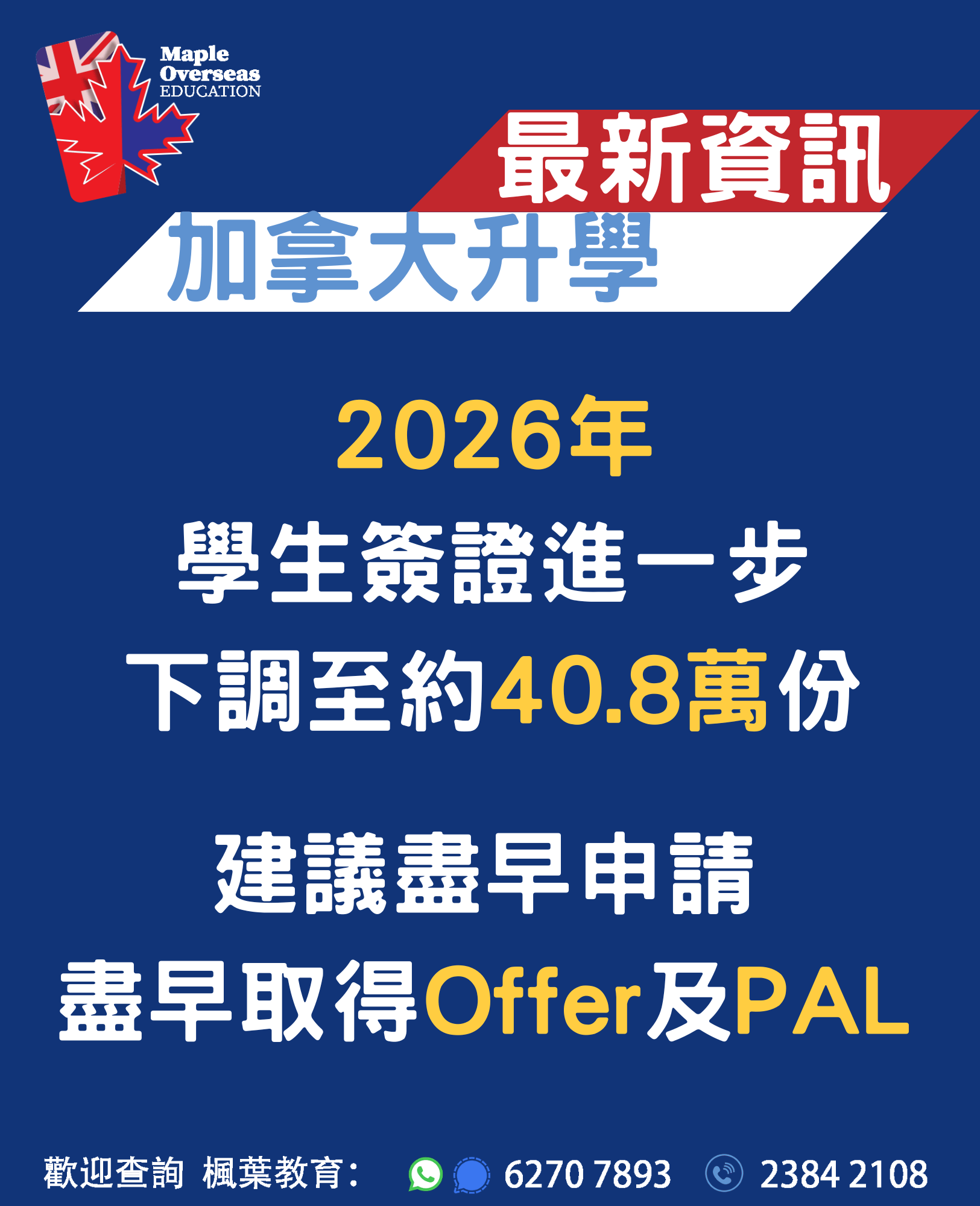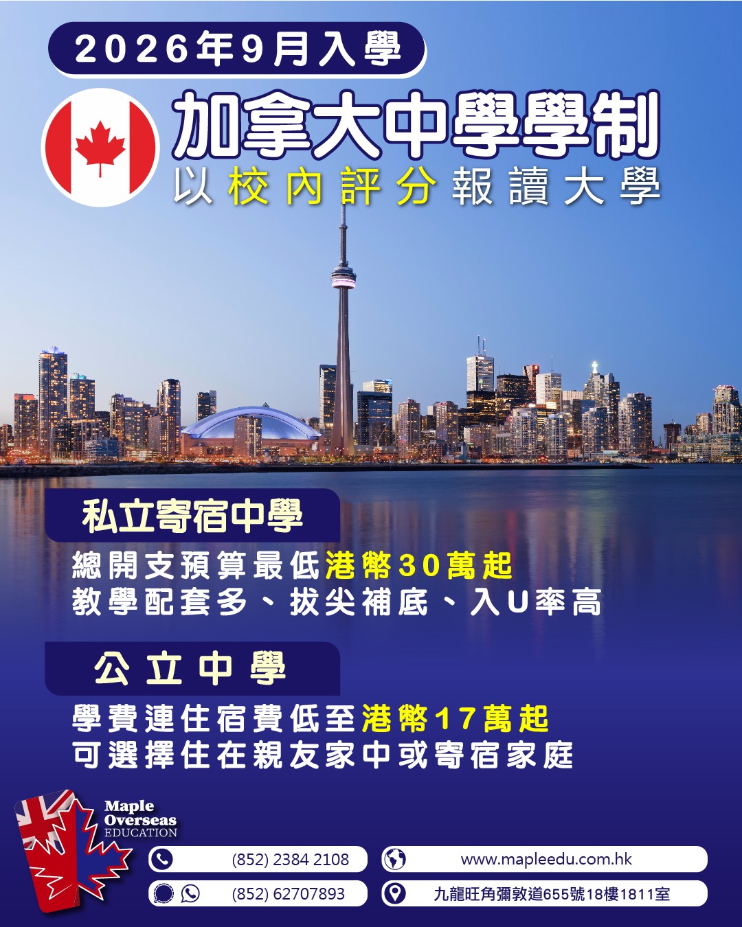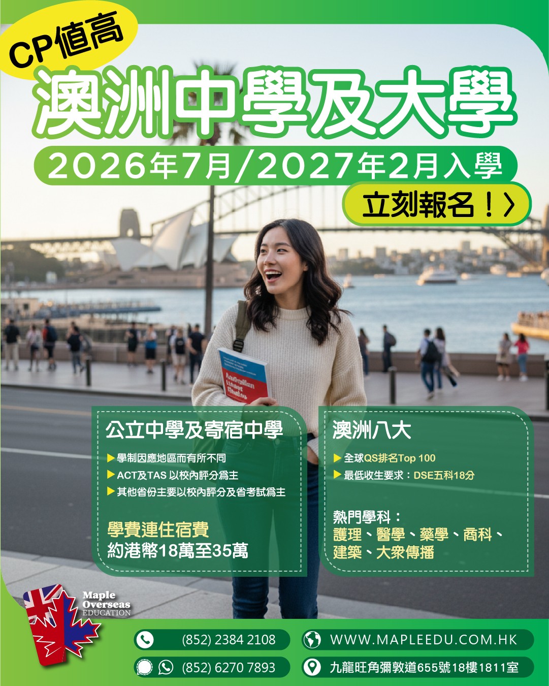 英國 升學 加拿大 升學 美國 升學 澳洲 升學 紐西蘭 升學 最新活動 英國升學資訊 加拿大升學資訊 澳洲升學資訊 升學顧問 | 一站式海外升學服務|楓葉教育 Maple Overseas Education 楓葉教育是專業的海外升學顧問,擁有近20年海外升學服務經驗。 幫助學生前往英國、加拿大、美國、澳洲、紐西蘭等地留學。 提供專業海外升學評估、UCAS咨詢、入學申請、海外簽證等服務。 卓越的海外升學服務 本中心與100多所海外院校保持著穩固的合作關係,為國內、香港及澳門的學生提供一站式海外升學服務,協助學生實現入讀英國、加拿大、美國、澳洲及紐西蘭等地頂尖學校的夢想。 本中心致力於為學生提供最優質、最全面的升學資訊,並竭盡所能幫助學生挑選最適合他們的學校。無論是申請手續、簽證申請、住宿安排或是課程選擇,我們的專業團隊都會提供最完善的支援。歡迎國內及港澳學生查詢海外升學服務。 專業海外升學顧問 本中心的團隊擁有近20年的海外升學服務經驗,多年來在海外升學行業建立良好的信譽及擴闊的人際網絡。 Maple創辦人Javis及他的顧問團隊均畢業於加拿大或英國著名大學學府,對於海外留學及生活的細節都十分熟悉,能夠以自己曾經的留學經驗,向那些未曾到外國讀書的學生提供深入的交流及建議,讓學生更充分地了解留學的各個方面,做好留學準備。 服務收費 本中心提供一系列專業、全面的海外升學服務,包括選校建議、申請指導、辦理學校入學申請、住宿安排等等,這些服務都是不收取任何費用的。本中心的收入來源來自於與海外院校的合作,作為學校的官方代表為家長和學生提供優質服務。然而,對於一些特別的升學需要,本中心會提供額外可選的收費服務。 家長及學生評價 更多意見反饋 一站式升學服務 全方位 升學諮詢及評估 專業、資深的顧問會為學生先進行成績評估,再為學生提供最合適的院校選擇,為學生度身訂做升學安排。 學校申請及 安排報考國際英語試 由幫忙協助填寫申請表,與校方進行面試、安排預約英文考試及核實成績及證書。 機票代辦及 簽證服務 楓葉教育幫忙提供機票價格查詢及幫忙訂購機票。更會為學生提供簽證安排,包括文件準備,翻譯文件及協助辦理簽證。 安排監護人 服務 提供監護人服務,並會跟家長跟進學生在當地與監護人之間的溝通,了解學生在當地的生活情況。 為學生安排 當地接機及住宿 楓葉會幫助學生提供接機服務及指導住宿安排。 跟進學生的海外學習 與生活概況 顧問會與海外學生進行緊密的跟進及了解學生在當地的生活及學習情況,幫忙學生盡快適應留學生活。 轉校 查詢服務 顧問會為學生進行轉校申請及查詢。包括由香港轉到海外讀書及已在海外讀書的學生轉校。 定期舉辦 教育展及面試 楓葉教育會定期參加不同類型的教育展,安排學生與校方代表見面及安排面試。學生可以透過Facebook,SMS,Whatsapp 及電郵接收到相關消息。 關於楓葉升學教育中心 楓葉教育 Maple Overseas Education 是香港知名的海外升學顧問,擁有近20年豐富經驗,協助無數學生成功實現海外留學夢想。作為專業的海外升學中心,我們提供一站式服務,涵蓋不同國家和不同年紀的升學評估、UCAS 申請、院校推薦、簽證辦理等,確保你的外國升學之路順暢無阻。 我們的海外升學顧問團隊熟悉英國、加拿大、美國、澳洲、紐西蘭等熱門留學國家的教育體系,能根據學生的學術背景、興趣及職業規劃,推薦最合適的升學方案。無論是申請頂尖大學、寄宿學校,還是語言課程,楓葉教育都能為你提供專業指導,讓你的海外升學旅程更輕鬆、更成功。 更多關於我們的資料 學校網絡優勢 楓葉教育升學中心與過百間海外院校及課程有合作關係,定期與各學校代表會面及保持聯絡,跟進不學生的需求,致力為學生提供最優質的升學資訊,為學生盡心盡力挑選最合適的學校及更有效率地幫助學生辦理入學,令家長安送子女到海外讀書。 海外升學必讀文章 英國大學聯招申請(UCAS Application)相信對有意往英國升讀大學的學生來說,對英國大學聯招方法(UCAS Application)不會陌生,今期主要是提醒大家四個重要的截止申請日期,準備申請明年9月入學者宜加倍留意。 Read more 英國大學銜接課程英國高等教育學府享負盛名,入讀頂尖大學,DSE起碼要5級起跳?其實入讀英國大學的途徑比你想像中多,亦比你想像中輕鬆,不用被它們的名氣嚇怕,你亦有機會成為這些大學的畢業生。 Read more 加拿大大學銜接課程身邊總有朋友想去加拿大讀書,熱門地區有多倫多、溫哥華等地,可能是喜歡當地的風景、享受當地的生活模式、嚮往當地的教育方式等等,又或者是在香港完成中學課程,想在念大學的時候離開舒適圈,在外面訓練自己獨立能力。 Read more 成功案例 畢業生分享 熱門學科及大學排名 更多熱門課程資料 為什麼選擇海外升學? 在競爭激烈的教育環境中,海外升學已成為許多學生和家長的優先選擇。海外升學能為學生提供更豐富的專業選擇和具國際認可性的教育機會。無論是英國、美國、加拿大還是澳洲的頂尖學府或頂尖中學,都能讓學生接觸前沿學科資源,並在全球化環境中培養流利英語能力,這對未來進入金融、科技、醫療等高端職業至關重要。 相比本地學制,海外升學途徑更靈活,例如英國3年完成本科、美國允許探索興趣後再選專業,而澳洲、英